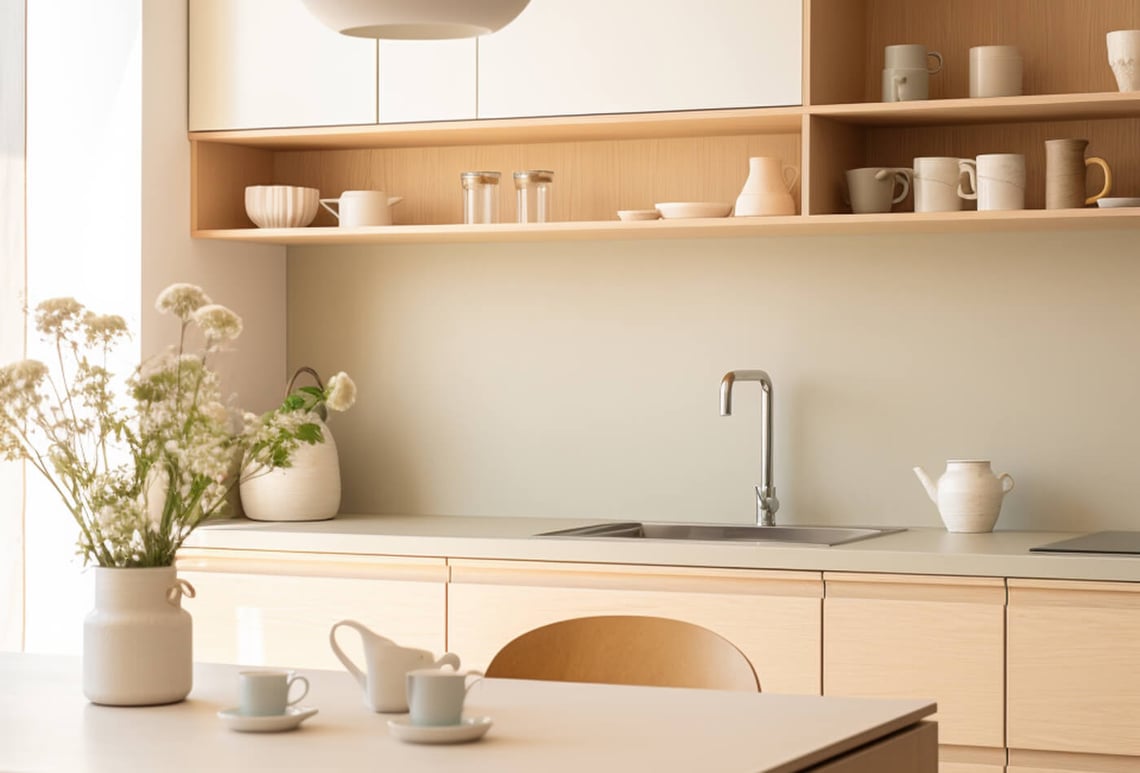 Pair gentle cashmere-coloured shelves with a formidable Marble or Granite countertop to create a beautiful comparison that adds depth and sophistication. Explore the best countertop installers in the UK.