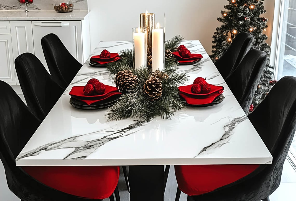 White Straight Quartz is stain-resistant and flexible for wintry weather table designs, providing a minimalist look for festive settings.