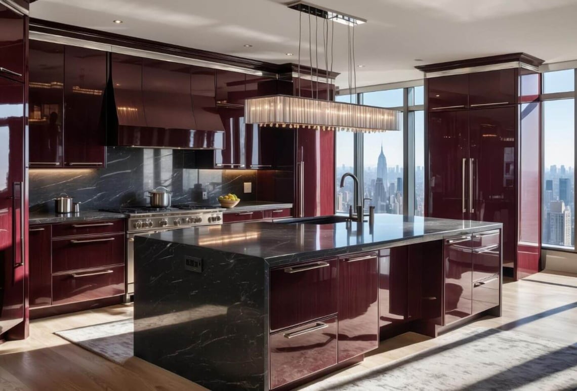 We know that these colours are popular for the 2025 countertops and cabinets. This colour is a sugar rush! Absolute Black Granite with deep plum red cabinets can make a powerful statement in 2025.