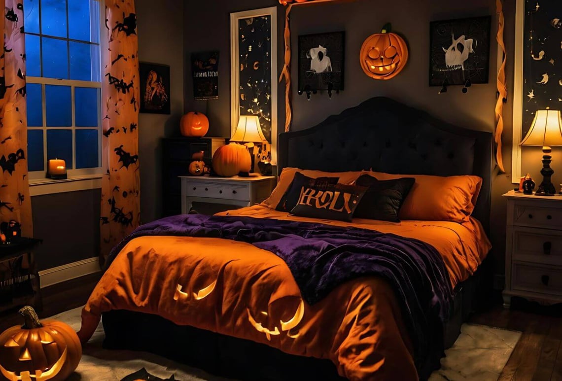Bring Halloween into your bedroom with subtle yet effective decor. Focus on textiles and lighting to make the space cosy but creepy. Wrap throw pillows in white gauze to create mummy pillows, and place them on your bed or armchair. Drape black or deep purple bed linens, and add throw blankets with spider web or skull patterns. Create a ghostly vibe by placing ghost decorations above your bed or near windows. To add to the eerie atmosphere, replace regular lights with dim or coloured bulbs (deep orange or green) to cast spooky shadows.
