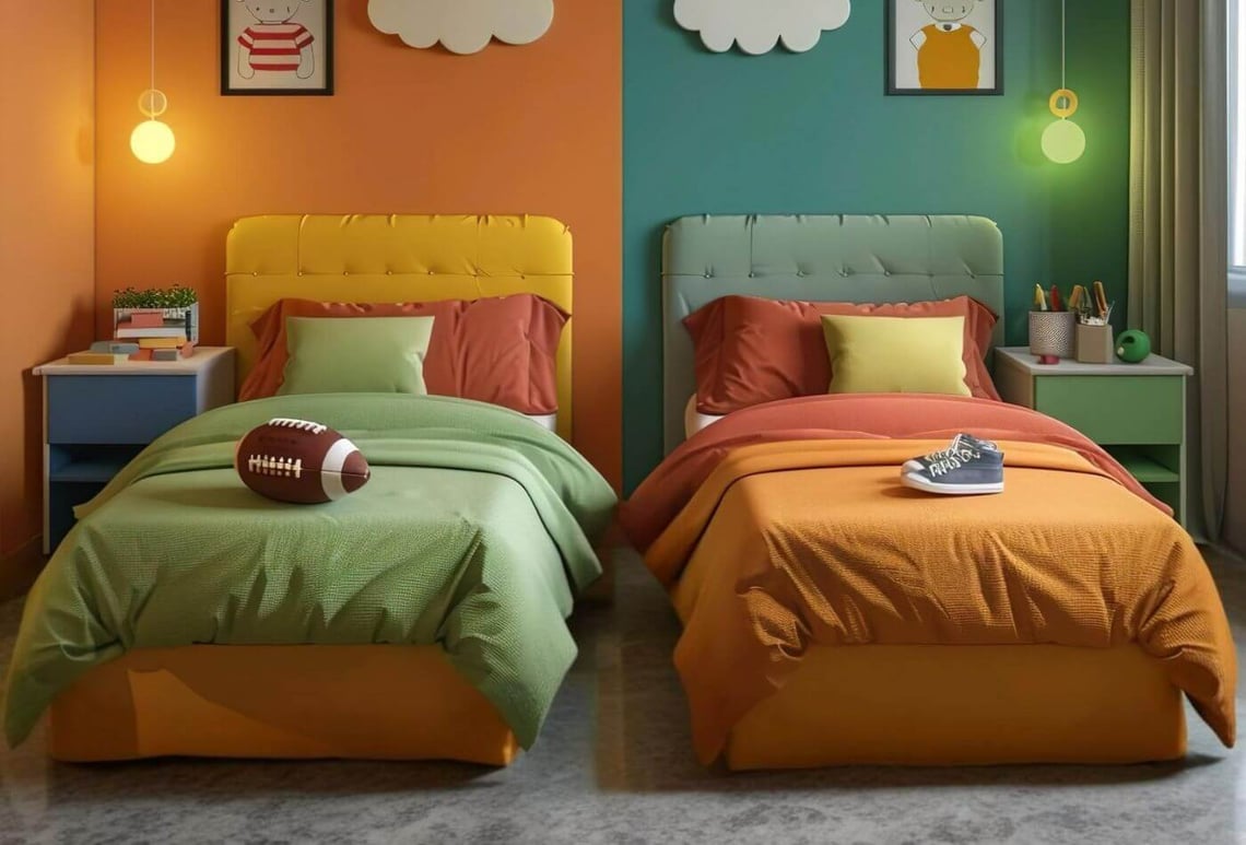 Two kids but one room! Let's say you have two kids, a four-year-old boy and a six-year-old girl, and they love to have fun and creative challenges. Possibly craft a space that helps both personalities to have fun while maintaining harmony. Start by choosing a neutral base colour for the walls, like soft grey or beige, and then use accents to highlight each child's preferences. You can dedicate one side of the room to each child, adding personal touches like themed bedding, favourite toys, or wall decals that showcase their individual interests.