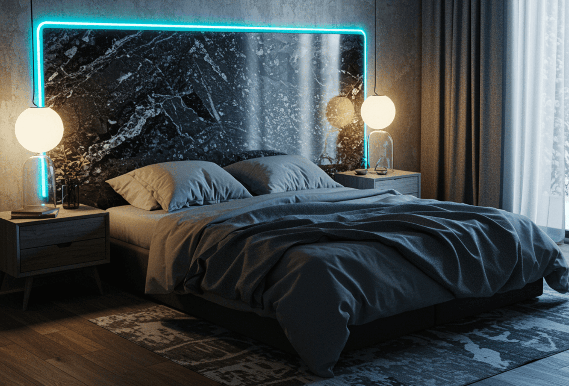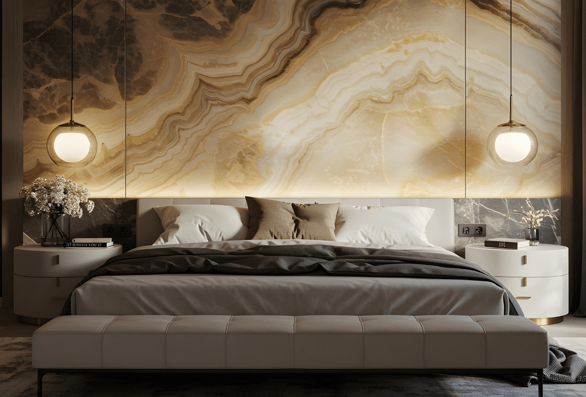 Now add backlighting, and boom, instant luxury hotel vibes at home. The translucent sections of the stone softly glow, highlighting natural patterns that look different every single night. No two slabs are the same, so your headboard is literally one of a kind. Try warm LED backlighting for a cosy, intimate feel, or cool white lighting for a sharp, ultra-modern aesthetic.