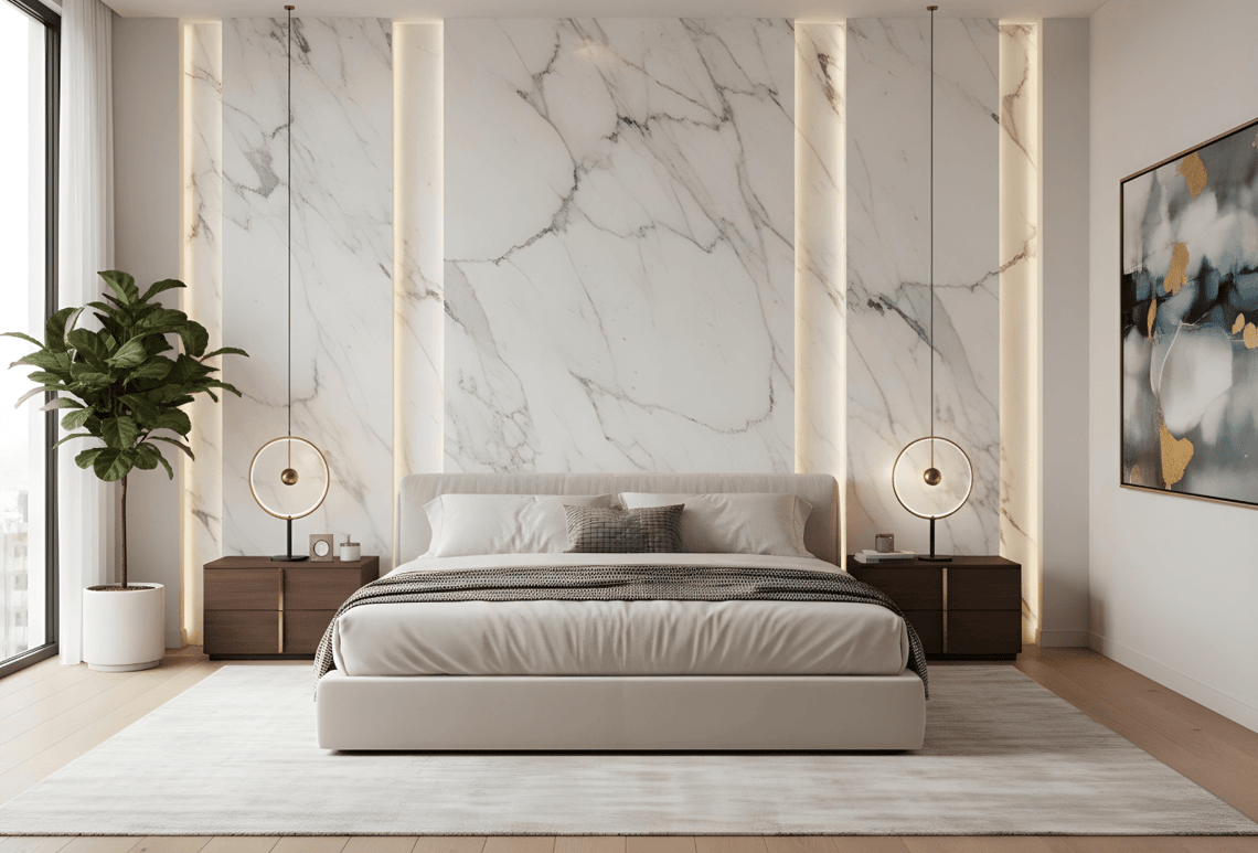 Colour-wise, this stone plays well with almost everything. Pair it with neutral walls for a calm, high-end look, or go bold with dark greys, matte blacks, or even muted greens to make the stone pop harder. Wooden bed frames, brass side tables, and soft linen bedding balance the drama perfectly.