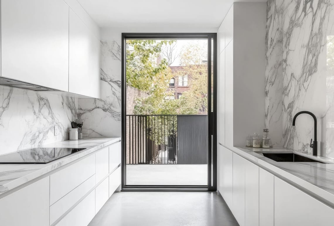 Ideal to be used on floors or accent walls, Marble enhances the easy appearance of a white kitchen.