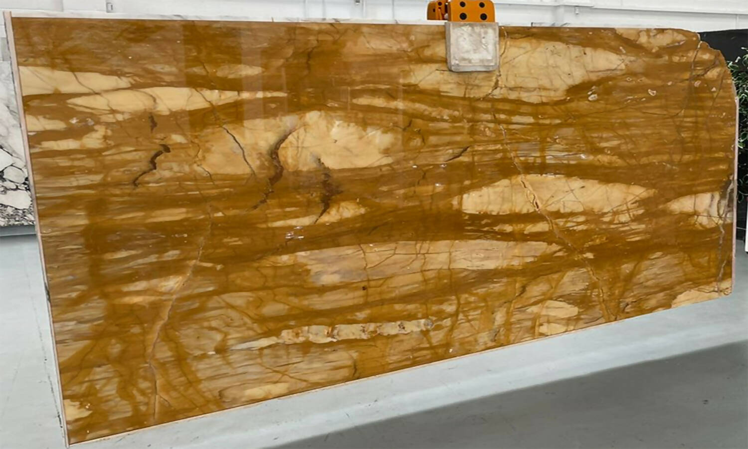 Giallo Sienna Marble Bookmatch Stone has a strong yellow base which is topped by brown-gold veins that appear like a gigantic tree’s roots engulfing the entire slab. This stone looks marvellous and will make any design, be it interior or exterior, look outstanding. This exquisite marble is a popular demand amongst both homeowners as well as trade members. It makes fantastic kitchen worktops, office walls, reception worktops, walls, floors, splashbacks, vanity tops, feature walls, stairs, fire hearths, etc.