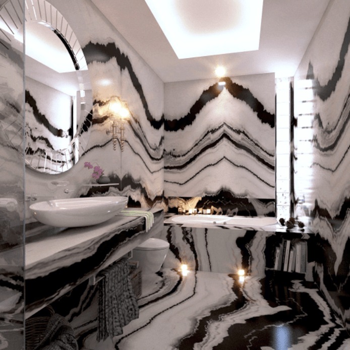 A marble-effect slab with a black and white surface background is called Panda White Porcelain. Panda White Porcelain, which is Chinese in origin, is well known for having incredibly dramatic black veins on a smooth white background. The most outstanding black and white tiles ever have been made from stunningly realistic Panda White Porcelain, which imitates the same Kitchen marble almost exactly.